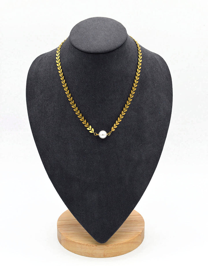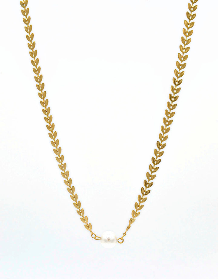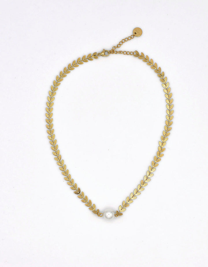 Collana girocollo in acciaio 316L dorato con foglioline lavorate e perla centrale. Le foglioline vanno a formare una catena, al centro è presente una perla coltivata del diametro di 1cm. Anallergica e inossidabile, resistente a gli agenti esterni. Lunghezza 42cm regolabile. Chiusura a gancio