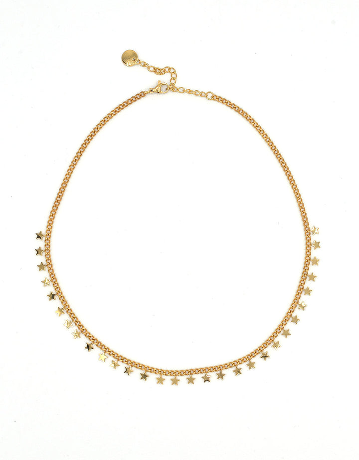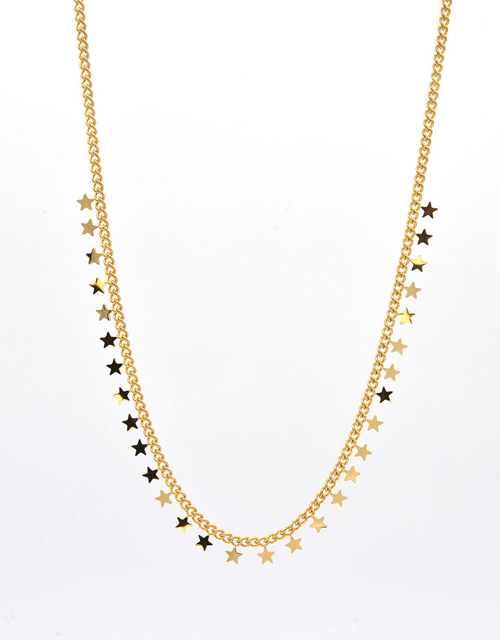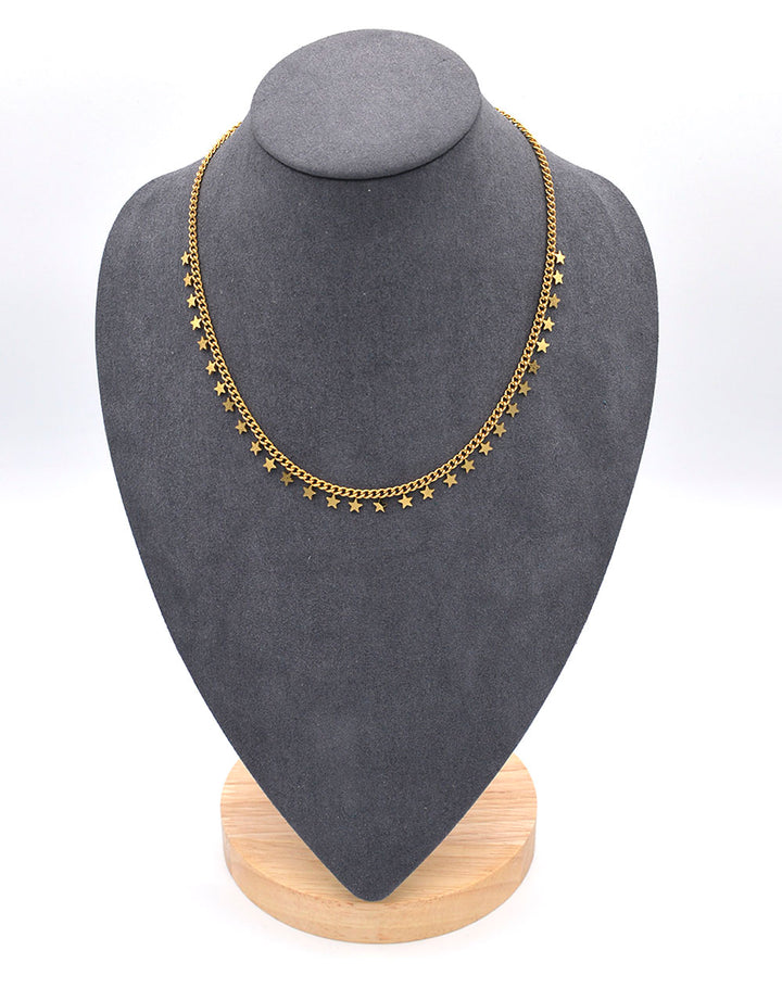Collana girocollo in acciaio 316L dorato. Formata da una catena con pendentini a forma di stelline. Anallergica e inossidabile, resistente a gli agenti esterni. Lunghezza 44 cm regolabile. Chiusura a gancio