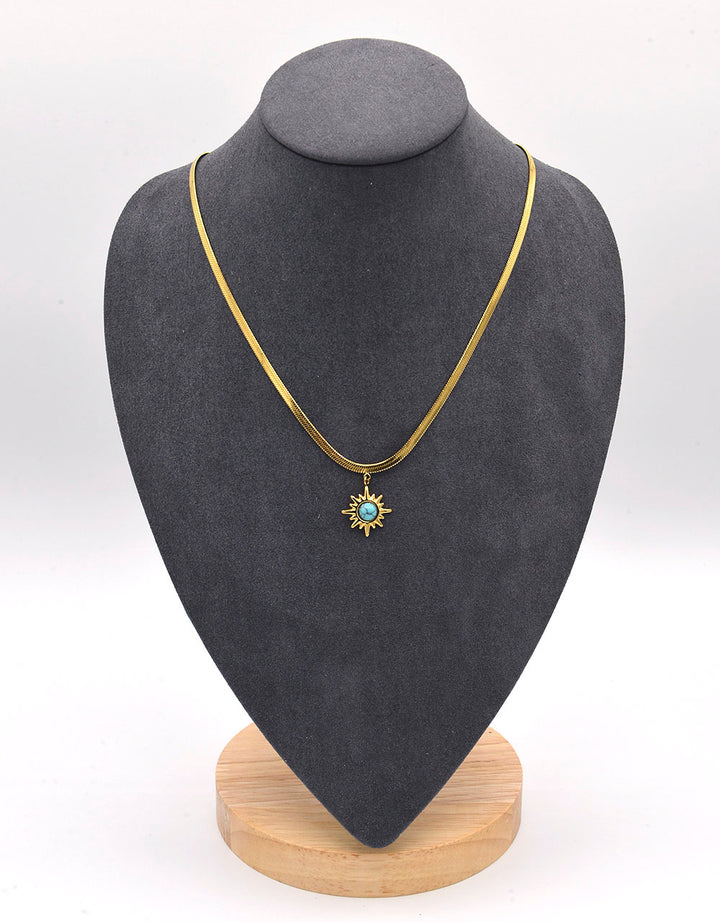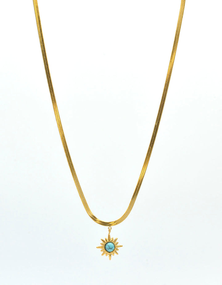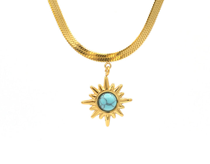 Collana girocollo in acciaio 316L dorato. Formata da uno shake piatto dell’altezza di 3mm e un pendente centrale a forma di sole con una pietra turchese. La sua flessibilità lo fa adattare perfettamente al collo. Anallergica e inossidabile, resistente a gli agenti esterni. Lunghezza 47,5 cm regolabile. Chiusura a gancio.