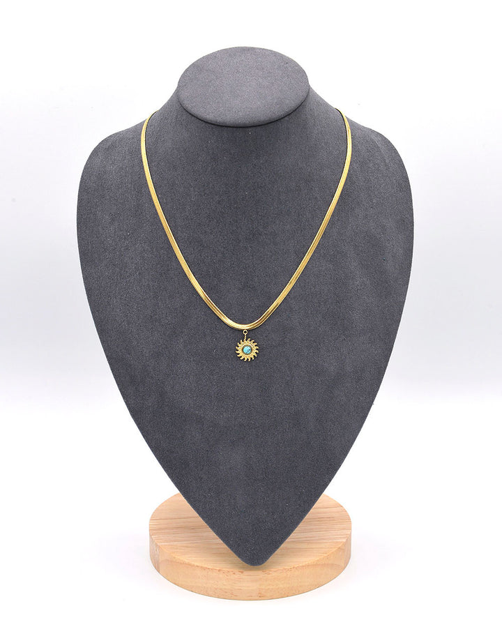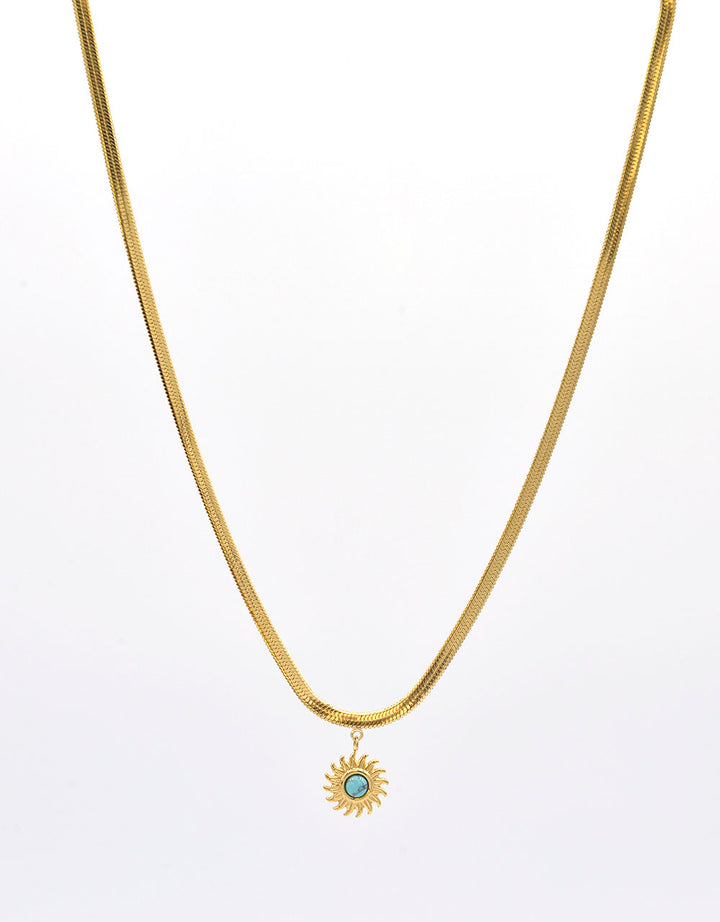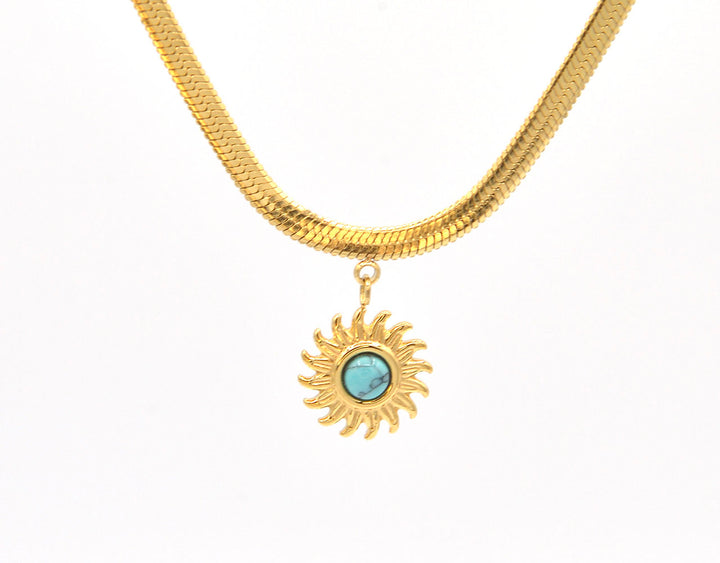 Collana girocollo in acciaio 316L dorato. Formata da uno shake piatto dell’altezza di 3mm e un pendente centrale a forma di sole con una pietra turchese. La sua flessibilità lo fa adattare perfettamente al collo. Anallergica e inossidabile, resistente a gli agenti esterni. Lunghezza 47,5 cm regolabile. Chiusura a gancio.