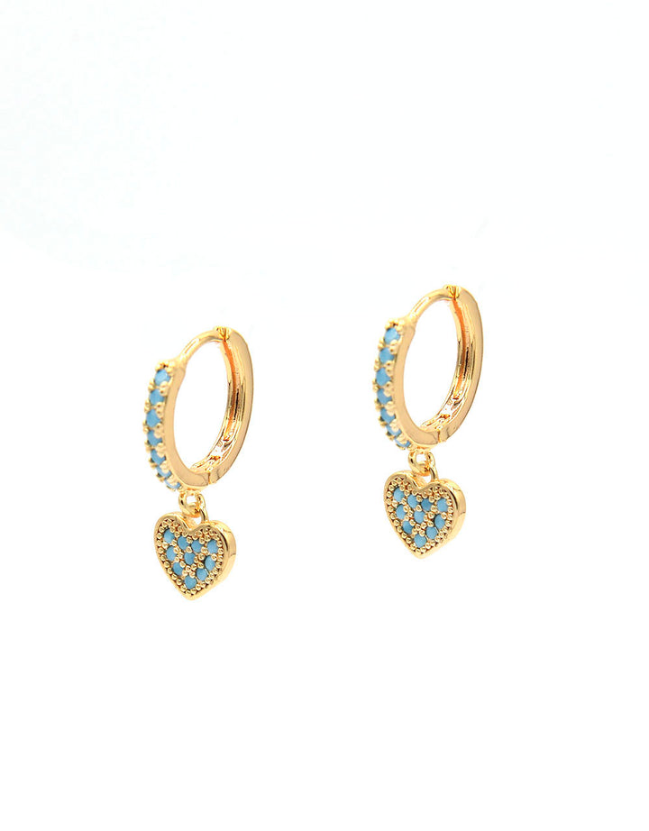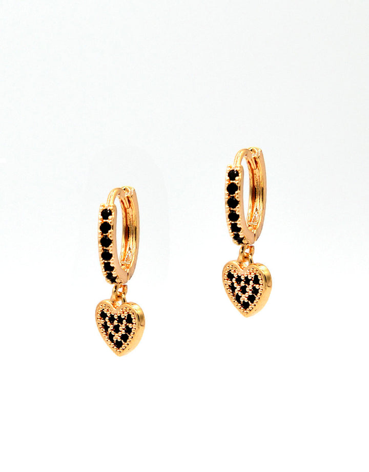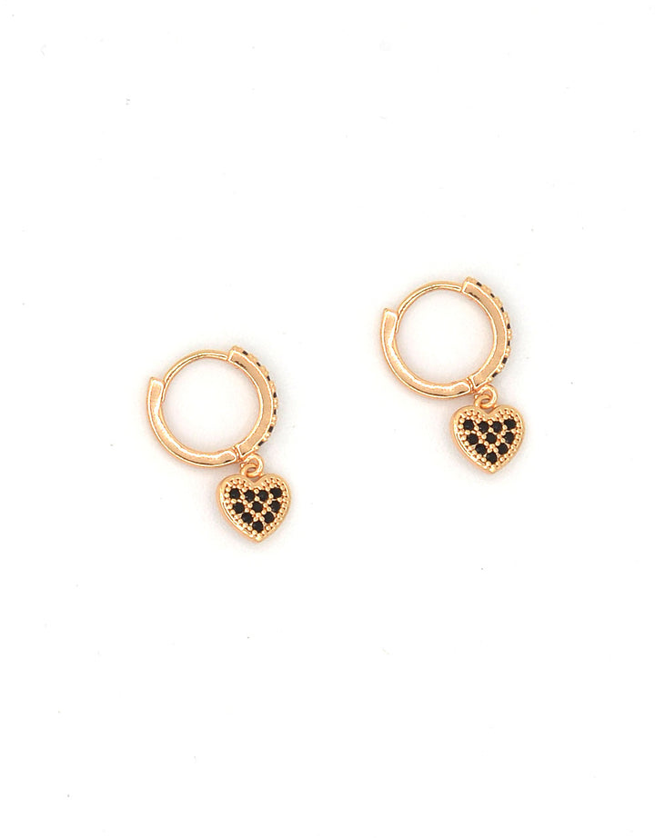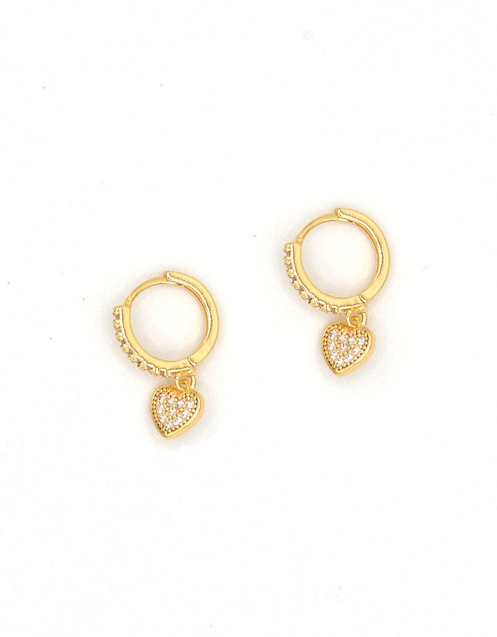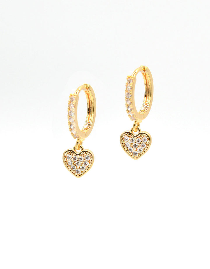 Orecchini in acciaio 316L dorato. Formati da un cerchio con zirconi incastonati e come pendente un cuoricino sempre con zirconi. Anallergico e inossidabile, resistente a gli agenti esterni.