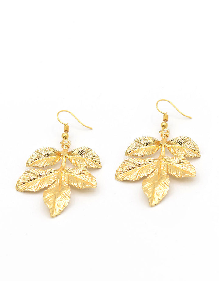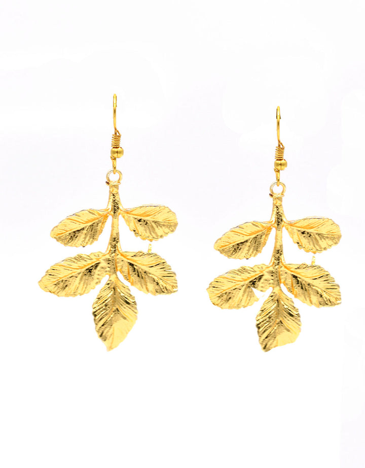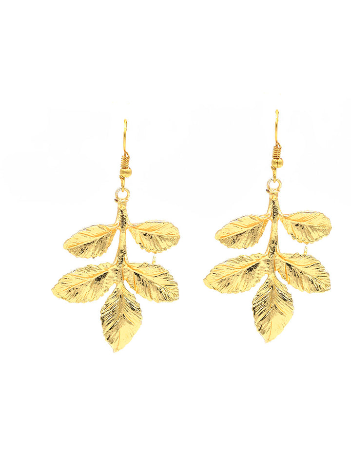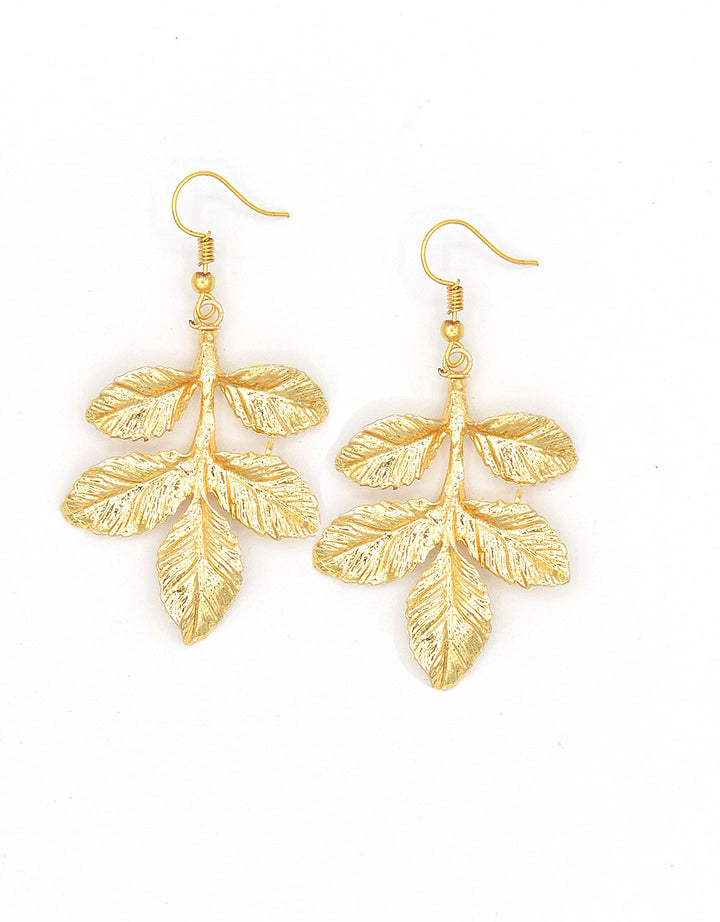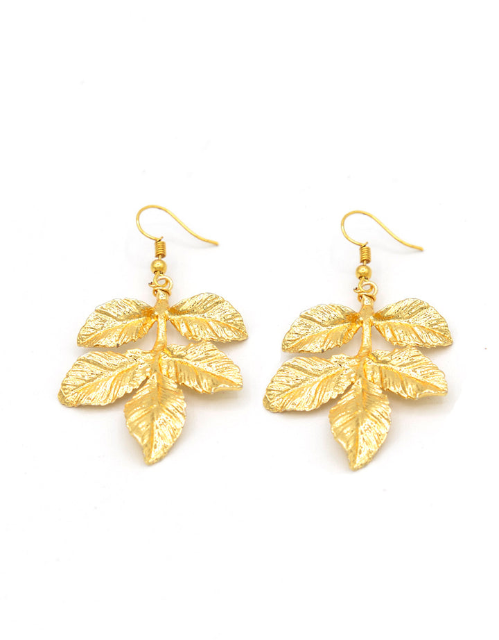 Orecchini pendenti in zamak dorato, composti foglie lavorate. Orecchini anallergici e resistenti agli agenti esterni. Misure: lunghezza 7,5 cm larghezza 3 cm