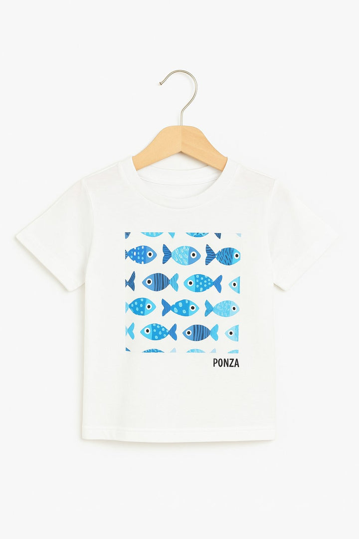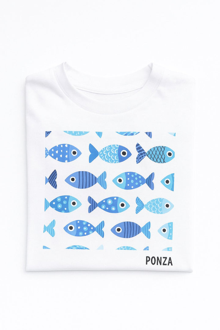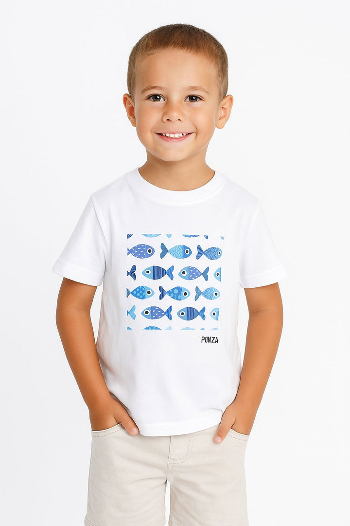Maglietta bimbo pesciolini blu 100% cotone.