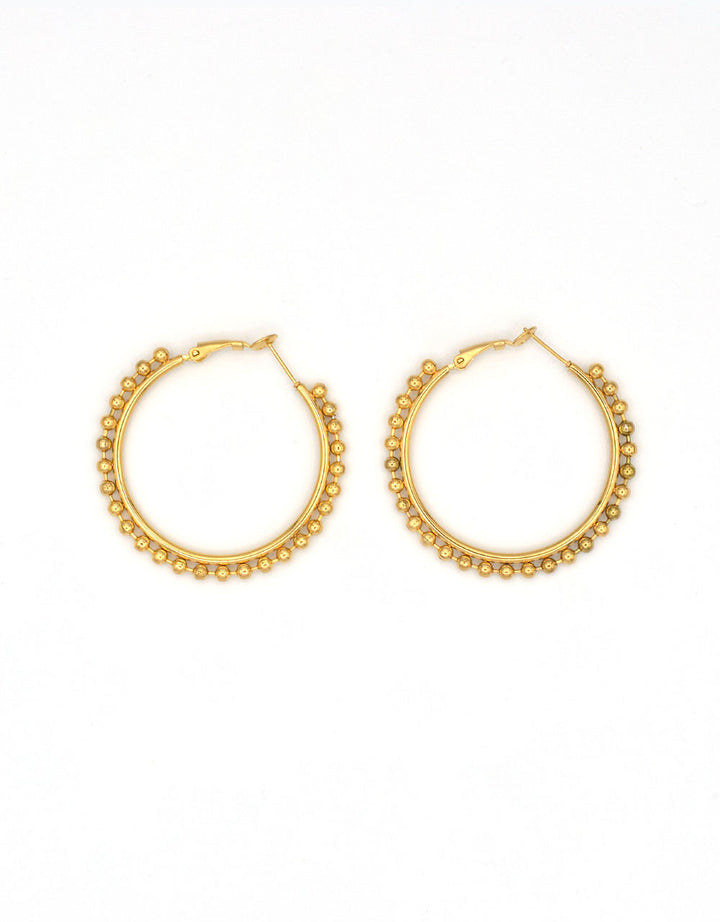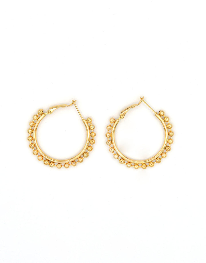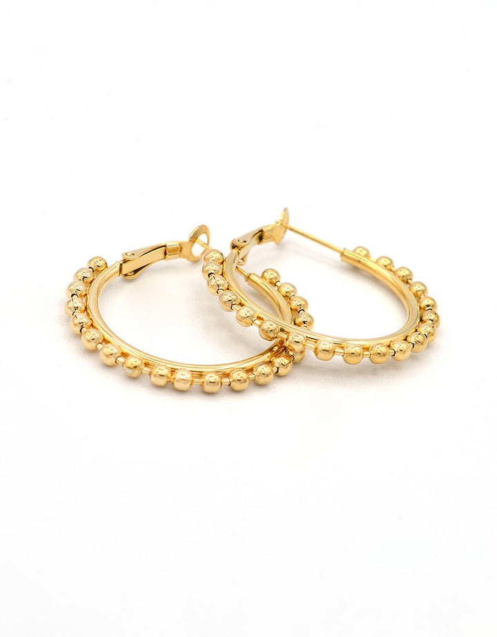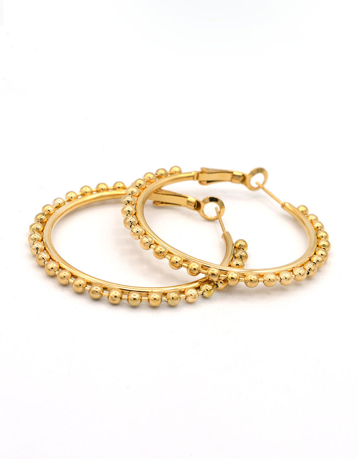 Orecchini in acciaio 316L dorato. Formati da un cerchio liscio con una fila di palline Anallergico e inossidabile, resistente a gli agenti esterni. Circonferenza 4,7 cm o 3,7 cm.