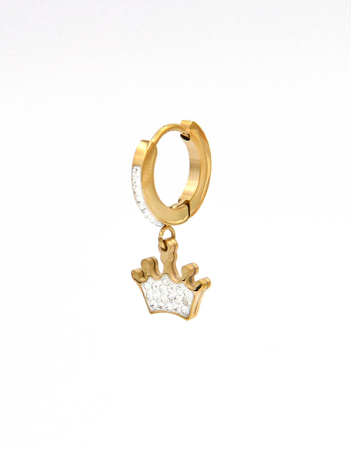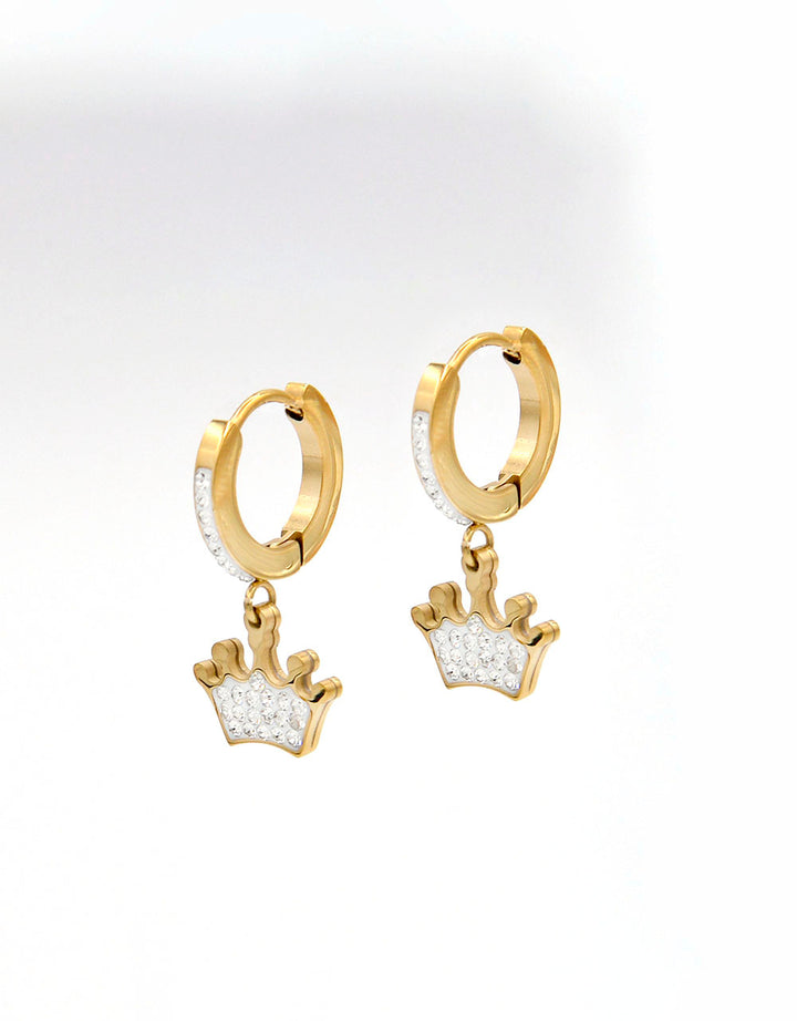 Orecchini in acciaio 316L dorato. Cerchio con brillantini di zirconi incastonarti. Pendente raffigurante una corona bianca impreziosita con zirconi incastonati. Anallergico e inossidabile, resistente a gli agenti esterni.