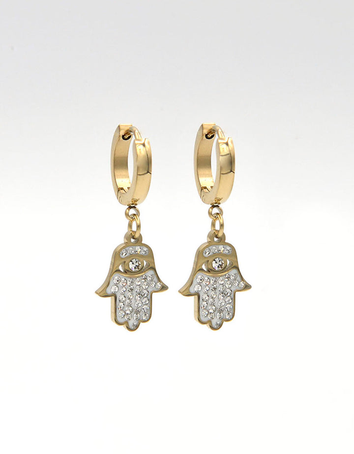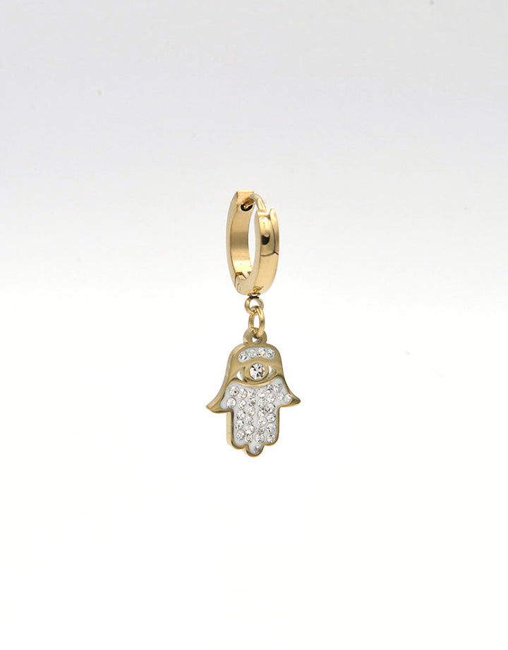 Orecchini in acciaio 316L dorato. A cerchio liscio e pendente raffigurante una mano di Fatima bianca impreziosita da zirconi incastonati. Anallergico e inossidabile, resistente a gli agenti esterni.