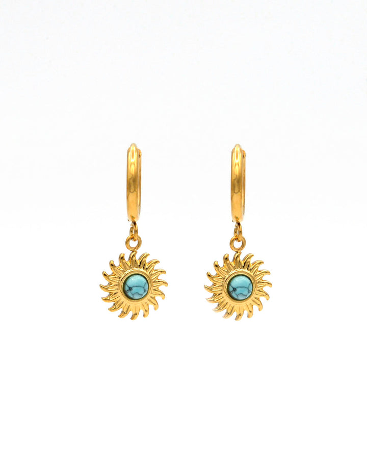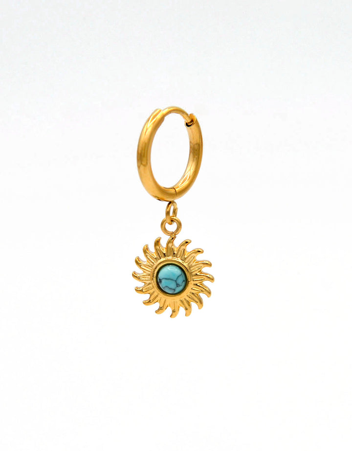Orecchini in acciaio 316L dorato. A cerchio liscio e pendente raffigurante un piccolo sole, con una pietra di turchese al centro. Anallergico e inossidabile, resistente a gli agenti esterni.